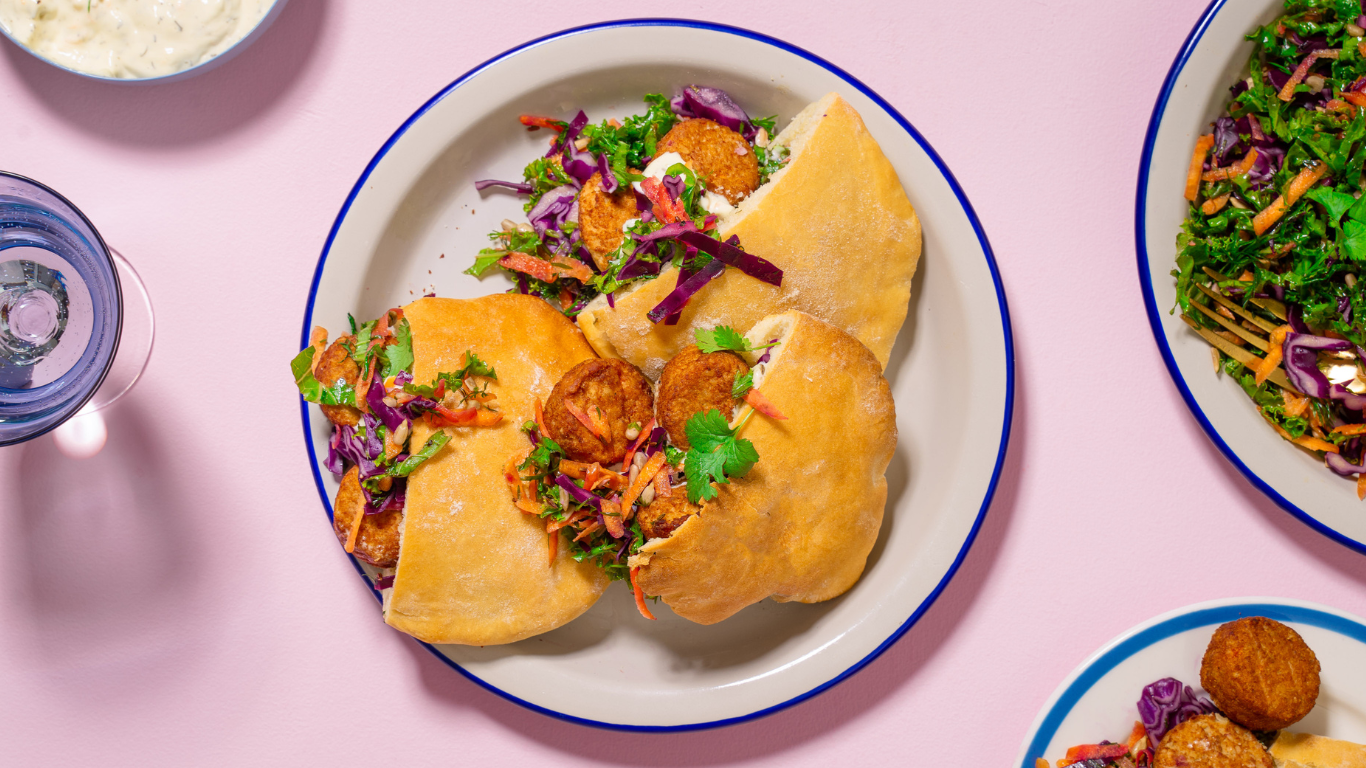 3. Valmista kalapitat. Lämmitä pitaleivät pakkauksen ohjeen mukaisesti. Täytä pitat laittamalla sisälle ensin vähän Remouladekastiketta. Lisää seuraavaksi punakaalisalaattia ja 2 kpl uunissa, airfryerissa, pannulla tai mikrossa lämmitettyä kalapyörykkää. Viimeistele tuoreella korianterilla.